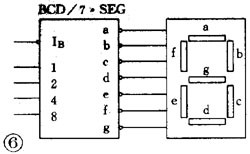 二极管,当每个段与低电平0连接时,七个段亮起并显示数字“8”;例如,段b和c与低电平0连接,其余段与1连接。显示“1”。可以看出,十进制数字必须用七段显示管解码一次。如果“4线7线解码器”与显示管一起使用,这非常简单:输入二进制代码直接显示十进制数字,如图3所示。解码器左侧有四个二进制码输入,右侧的7个输出可以直接连接到数字管。左上方是来自控制端子IB的另一盏灯。在正常操作期间,应增加高电平1。如果不需要数字显示,则应将低电平0添加到IB以关闭数字显示。